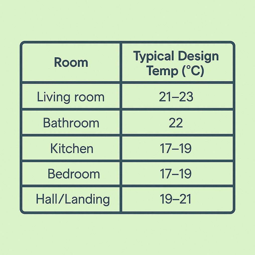 Let’s keep it practical. BS EN ISO 7730 and BS EN 12831 give us solid guidance on design temps for different rooms in the UK.